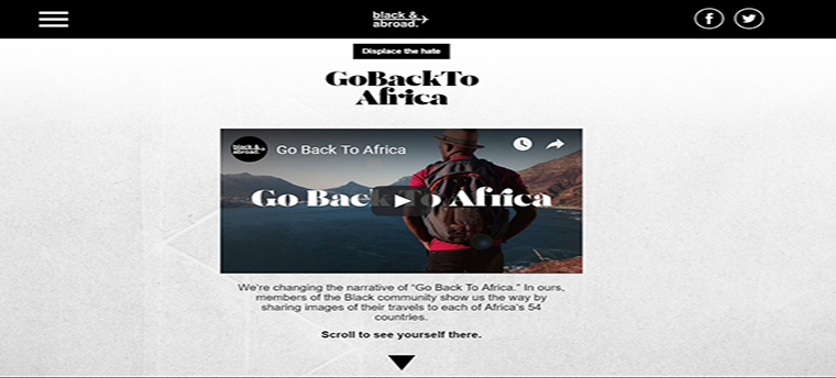為了改變人們對非洲“充滿危險、野蠻”的刻板印象,把非洲視為一個風景優美的旅游勝地。致力于服務美國的黑人社區居民的美國旅游品牌Black&Abroad洞察發現,黑人歧視從“三角貿易”至今都普遍存在,尤其是在社交網站上,幾乎每三分鐘就有一句“Go Back To Africa”(滾回非洲)這種歧視性的語言出現,同時還發現旅游廣告中很少出現黑色人種代言或平面模特。于是Black&Abroad聯合創意機構FCB/Six多倫多推出了Go Back To Africa這個活動,旨在宣傳自身品牌,同時也消除人們對非洲以及黑人種族的普遍誤解和歧視。這種形式品牌“故事”宣傳不僅傳播自己的品牌,并且消除人們對非洲的誤解和種族歧視,做到一石多鳥??!