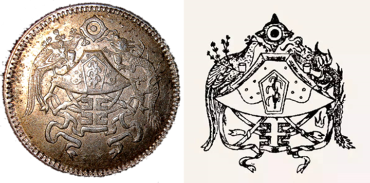 十二章國(guó)徽是傳統(tǒng)文化和西方文化相結(jié)合的產(chǎn)物。十二章國(guó)徽將十二章紋匯聚一起,是參考了西方國(guó)徽、章紋的布局。西方章紋自問世起便以盾牌為居中的核心圖案,其他部件皆附屬之;黼可看作是盾的變體。西方章紋的盾牌左右兩側(cè)為“扶盾者”,由人物、動(dòng)物或傳說神獸充任;“龍”與“華蟲”正飾演了這個(gè)角色。此外,構(gòu)成“山”的飾帶展現(xiàn)方式也完全是西式的。