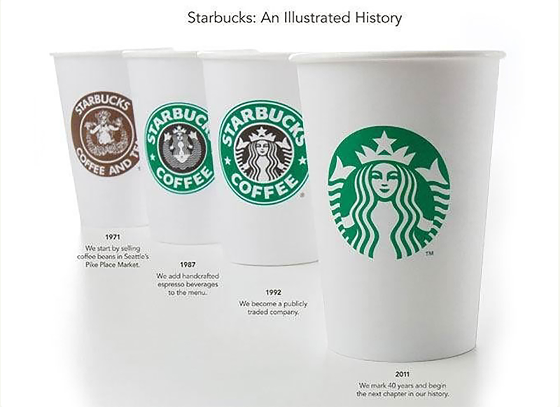 1971 - 1987,公司最早的logo便是最露骨的美人魚,后來在1986年注冊了僅有STARBUCKS字樣的這個標志,美人魚樣子沒有變化,1989年注冊的商標顏色換成了綠色,美人魚依然是全身像,但是更加像標志了,符合時代審美的特點。2011年,“星巴克”的品牌LOGO再次進行改變,將原本環繞在圓形美人魚圖像以外的外圈直接拿掉,并去掉位于內圈和外圈之間的“STARBUCKSCOFFEE”的字樣,只保留了再次進行放大處理的美人魚圖像;整體來看,這個版本的LOGO更加簡潔、時尚。